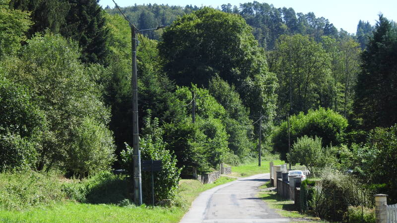 Het is geen fijne plek om te blijven staan, dus zetten we koers naar Val-et-Chatillon. Als we bij de ingang van de officiële camperplaats staan, worden we tegengehouden door een hek. De camperplaats wordt gebruikt voor het Mariafeest. Tegen onze zin moeten we weer verder. Een plekje in het buitengebied van St Quirin wordt het nieuwe doelwit. Daar zal toch geen feestje zijn, is onze veronderstelling.
