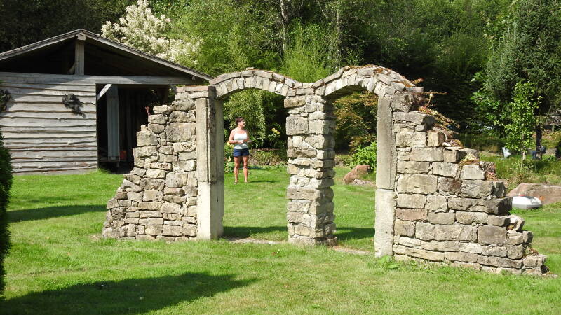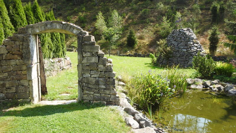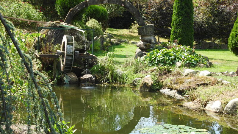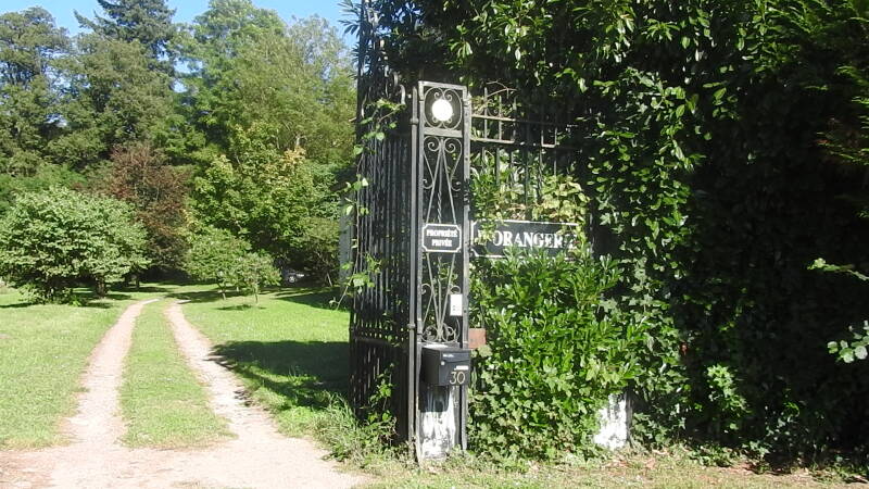 Vandaag gaan we twee grote tuincomplexen bezoeken. De eerste ligt op de route en de tweede kunnen we vanaf onze nieuwe standplaats bewandelen. Nadat we onze aardige buurman gegroet, vertrekken we voor een relatief korte rit. Niet veel later parkeren we voor een groot bord met daarop het logo van de tuin en een pijl naar links wijzend richting de ingang. Maar dat laatste ontgaat ons volledig en wij lopen rechts het weggetje in. Na een tijdje begrijp ik dat het niet goed komt. Een Fransman legt mij uit dat we terug moeten naar het parkeerterrein. Daar zien we nu wel de poort met het woord ingang erboven.