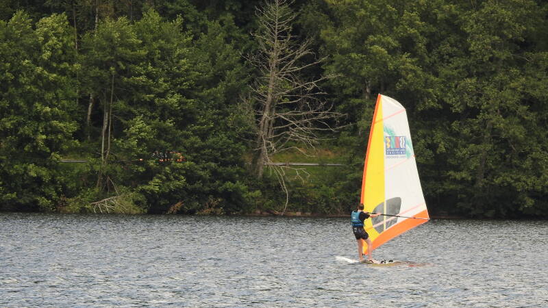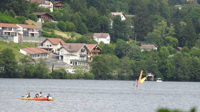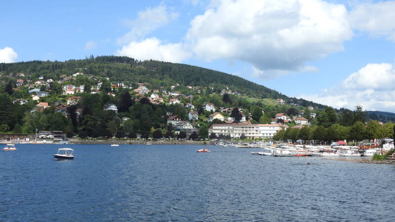In Gerardmer halen we wat boodschappen en parkeren dan in het centrum. Het bruist hier van het toerisme. De plaats ligt tegen een natuurlijk bergmeer aan. Dit water zorgt voor de drukte. Er loopt een heuse boulevard langs het water. Allerlei ondernemers zijn hier aan het vissen naar de beurs van de bezoeker. Bootverhuur, snacks, ansichtkaarten, snuisterijen, hier kun je geld uitgeven. Ons doel is een wandeling rond het meer. Dat is goed te doen want het heeft een lengte van twee kilometer en een breedte van een paar honderd. De gemeente heeft gezorgd voor een sentier sur lac. Aanvankelijk is het een prima te belopen zandpad. Maar na enige tijd moeten we over rotsen en boomwortels klauteren. Er naast ligt, achter een hek, een prima weg maar dat is propriété privé. Toch is het struikelend een mooie uitdaging. Dat vinden ook meer mensen, want het is druk op de sentier. Op het water vaart werkelijk van alles. Waterfietsen in de vreemdste vormen, kano’s, klassieke surfplanken, zeilboten en als topper een bescheiden rondvaartboot. Om de honderd meter staat een hotel-restaurant. Door flink door te lopen, komen we weer bij het begin.