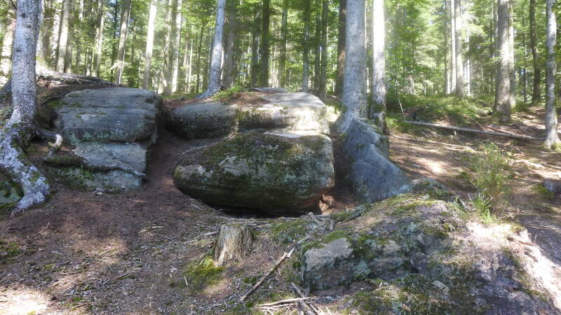 Een klein ritje van nog geen 10 kilometer. De camper parkeer ik op een keurig aangelegde plaats, bedoeld voor dit soort wagens. We worden omsloten door natuur. Veel loofbomen, afgewisseld door een enkele den. Het terrein is verre van egaal, en achter ons zien we een heuvel fors oplopen. Onze stek valt onder Ferrette. Weer zo’n heerlijk rustig Frans plattelandsplaatsje. Het weer is voortreffelijk. Niet te heet, niet te koud.