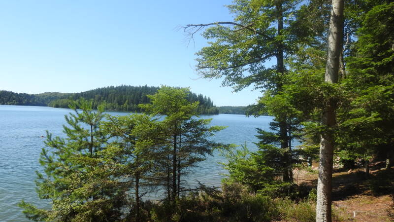 Als we richting de parkeerplek bij het stuwmeer rijden, komt mijn eerste vrees al uit. De plek staat bomvol. We hebben geen andere keus dan doorrijden. Bij een tweede mogelijkheid kunnen we langs de toegangsweg naar de parkeerplaats staan. Een hoogtebalk verhindert verder doorrijden. We slepen ons terras het bos in. We picknicken tussen de dennenbomen met als bonus een heerlijke dennengeur. Om het meer te zien moeten we een fikse afdaling maken om een klein glimpje te zien.