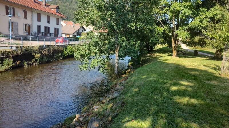 Als de zon de schaduw verdrijft, die mij probeert koel te houden, vinden we het tijd worden voor vertrek. Ons eerste doel vandaag is het plaatsje Corravillers. In de nabijheid hiervan is een waterval. We rijden in rustig tempo naar dit tien kilometer verderop gelegen dorp. Als we op de camperplek arriveren, zijn we beiden onder de indruk van de schoonheid van de plek. We staan met de neus tegen een snel stromend watertje aan, met een aardig boogbruggetje stroomopwaarts. Hoge bomen zetten de hele plek in de schaduw.