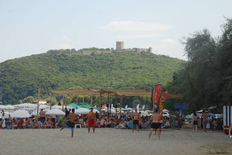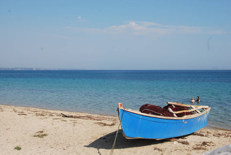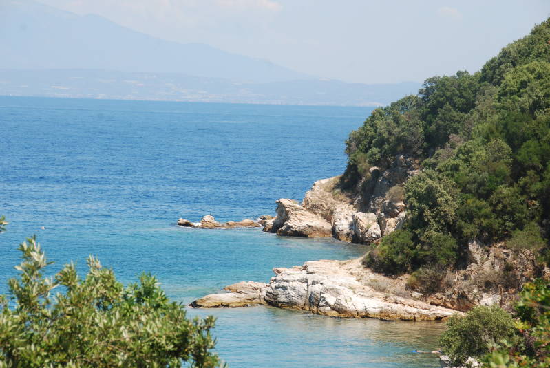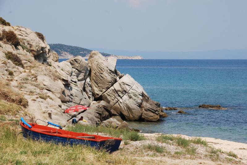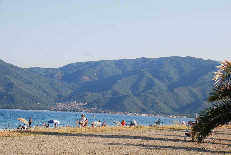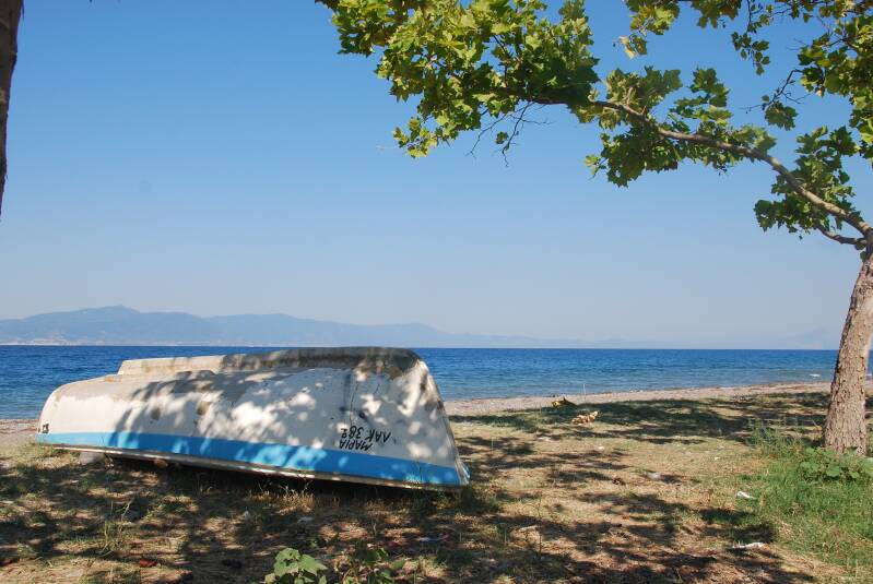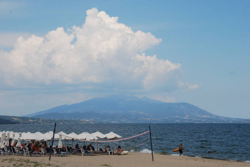We zoeken het wel verderop. Weer volgt een schitterende route langs de kust van Sithonia. Net voorbij Sarti vinden we onze plek. Een rustig strandje, niet veel schaduw maar een magnifiek uitzicht op de berg Athos. Het is gezelligheid. We staan naast een Australiër met een camper en een Servisch gezin die in een tent bivakkeren. Met beiden maken we een uitgebreid praatje. Ook komt een Nederlander nog even buurten. Hier houden we het wel weer even uit.