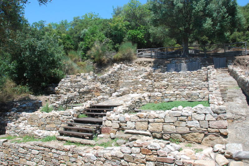 Hanna en ik gaan wel voor de geschiedenis en werken ons omhoog. Daar op een rotspunt, wat als schiereiland de zee inloopt, ligt het oude Stagira. Terplekke zijn markeringen voor de looprichting aangebracht zodat het vanaf nu zich zelf wijst. We klauteren langs meerdere ruïnes en hebben soms een prachtig uitzicht op de baai waar het gewone volk ligt te zonnebaden.