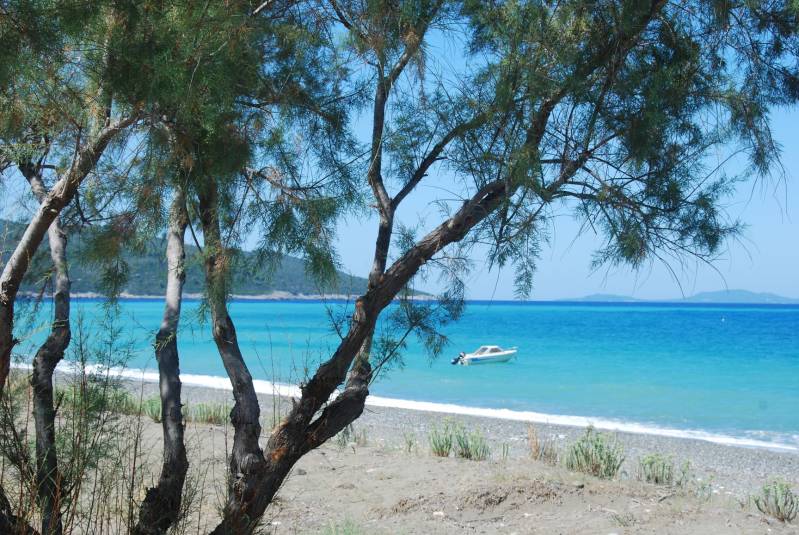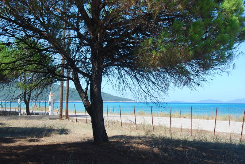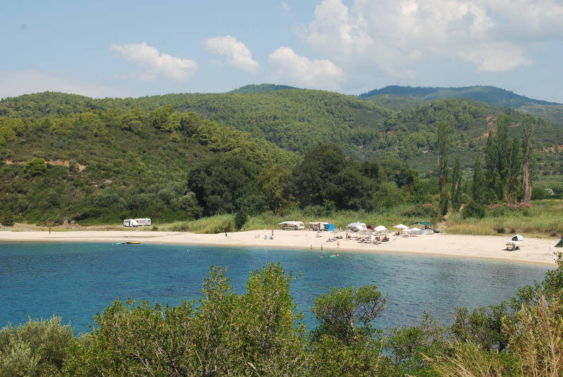 Op een veldje, onder de heerlijk ruikende larixbomen hebben we een prima plekje gevonden. Iets verderop is een strandbar met muziek, zodat bij ons de radio uit kan. We hebben de vrije blik over de golf van Kassandra. Een jacht ligt voor anker en op het strand is het bijna een aangesloten dak van parasols.