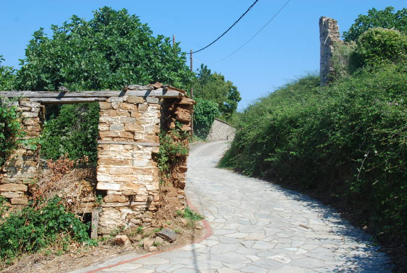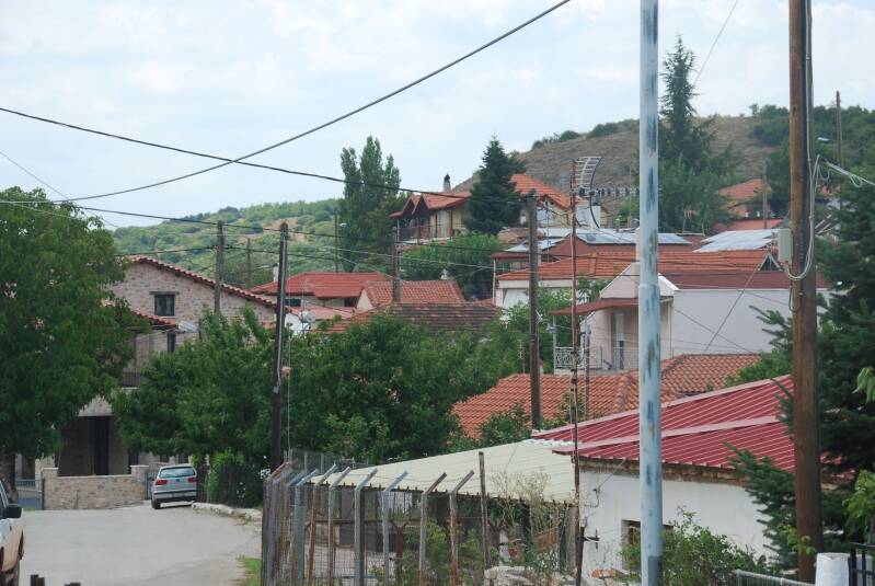 We wandelen het dorp in. Op verschillende plekken staat een ruïne in plaats van een knappe woning. Maar de nog wel bewoonde panden staan er zonder uitzondering tiptop bij. Na enige tijd komen we terug op het dorpsplein. Het feest is in volle gang. Op de weg worden grote vuren gestookt met houtskool. De gloeiende massa wordt in een grote barbecue gekieperd om een vleesgerecht aan een stokje op smaak te brengen. De band gaat helemaal los. Het is zuivere Griekse muziek en een aantal buspassagiers begint een typisch Grieks dansje.