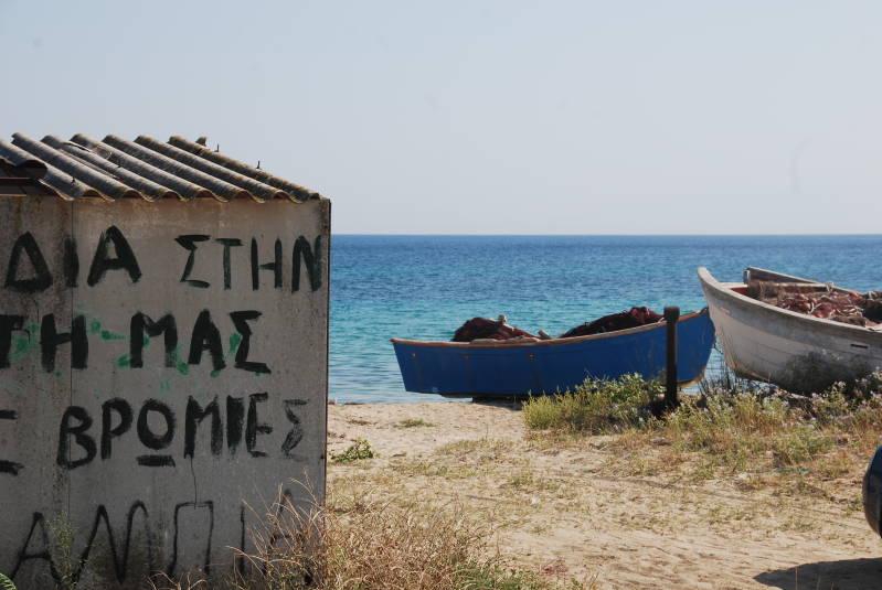 We arriveren in Vourvourou. Pio en Mio geven verschillende doelen aan. We volgen Mio want die wil een rustige weg in. Het is zeer druk en personenauto’s zoeken wanhopig om een plaats. Aan het eind van de rustige weg worden we warm onthaalt door borden met daarop in grote rode letters “NO CAMPING”. Klare taal, en dat voor een Griek. We staan naast een vervallen campingterrein en besluiten deze op te rijden voor nader beraad.