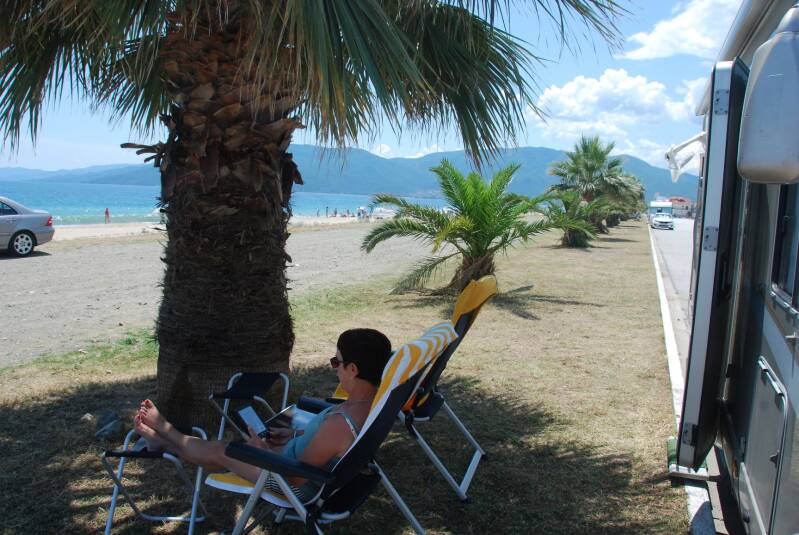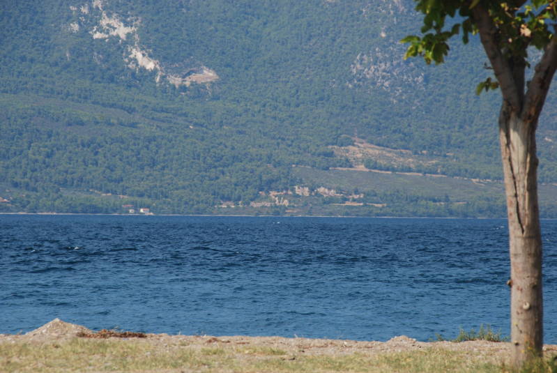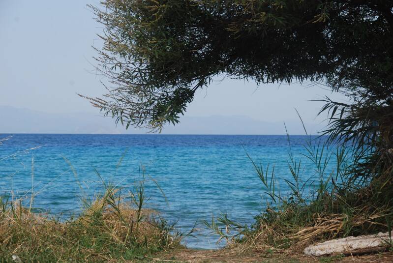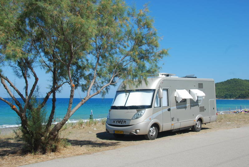 De nachtplek, welke ons is aanbevolen, vinden wij drie keer niks. De motor gaat weer aan en we slingeren ons weer langs de kust op weg naar Ierissos. Wat een fijne plek treffen we daar aan. Een brede strook natuur van zo’n 200 meter ligt langs de kust. Op het eerste deel groeit een dennenbos maar tussen de bomen is veel ruimte. En die wordt gebruikt door vrij-kampeerders. Hier en daar staat een tentje, enkele campers en een heuse caravan. We schuiven de hymer onder een hoge lariks. Heerlijk koel onder boom kijken we uit op de zee die een 100 meter verder ligt.