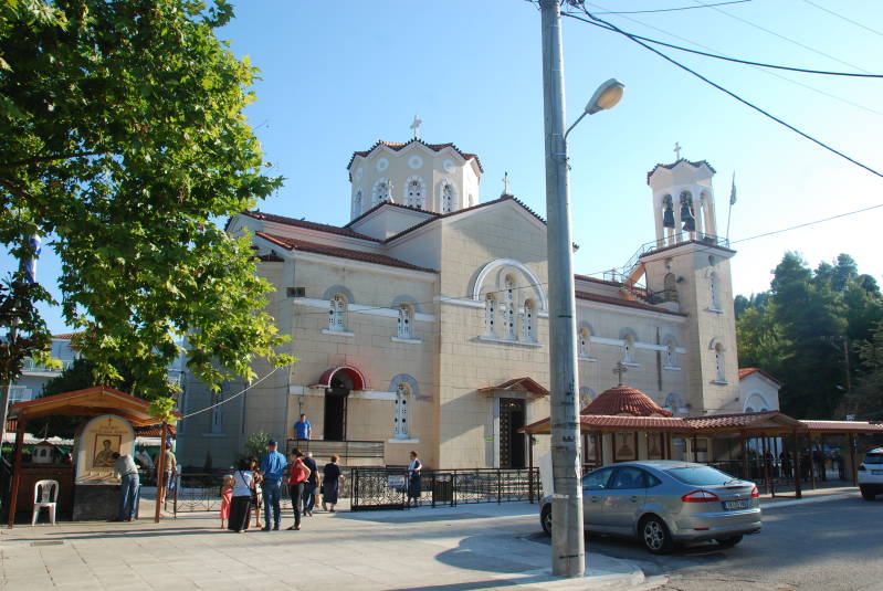 Kennelijk zijn wij niet de enigen die het oude Griekenland willen ervaren. De toegangsweg staat tjokvol geparkeerde auto’s en na moeizaam draaien kan ik nog net achter de twee bussen een plekje vinden. Te voet gaan we direct steil omhoog. Er klinkt muziek en veel geroezemoes van boven. Op het afgezette dorpsplein is de inhoud van de reisbussen neergestreken. Verkeer dient om te rijden. De kerk van het dorpje komt wat in het gedrang maar we kunnen naar binnen. Het is er vrij donker. Veel fraai houtsnijwerk en geschilderde iconen op panelen. Alle zitplaatsen hebben een hoge zijkant. Een wand met een doorgang deelt de ruimte in tweeen. Twee gelovigen komen binnen en kussen daarbij een schilderij. Ieder geloof heeft zo z’n eigenaardigheden. Als je wilt kun je een kaarsje branden.
