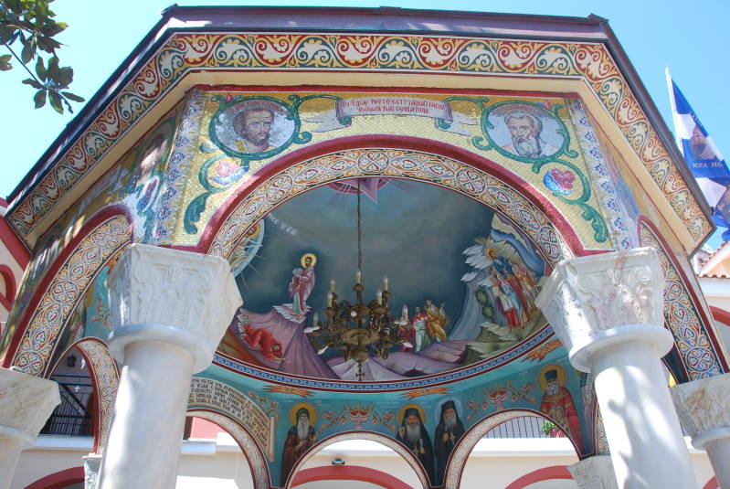 We lopen het kerkje binnen. Opnieuw zien we de toepassing van veel primaire kleuren met veel groen maar ook rood, geel en blauw. Weinig gemengde kleuren zodat het enigszins eenvoudig overkomt. De wanden en plafond zijn op deze wijze beschilderd met allerlei bijbelfiguren. Een portret van Osios David doet velen ontroeren en ook hier wordt gekust. De inrichting doet vrij katholiek aan en de gelovigen slaan ook doorlopend een kruis.