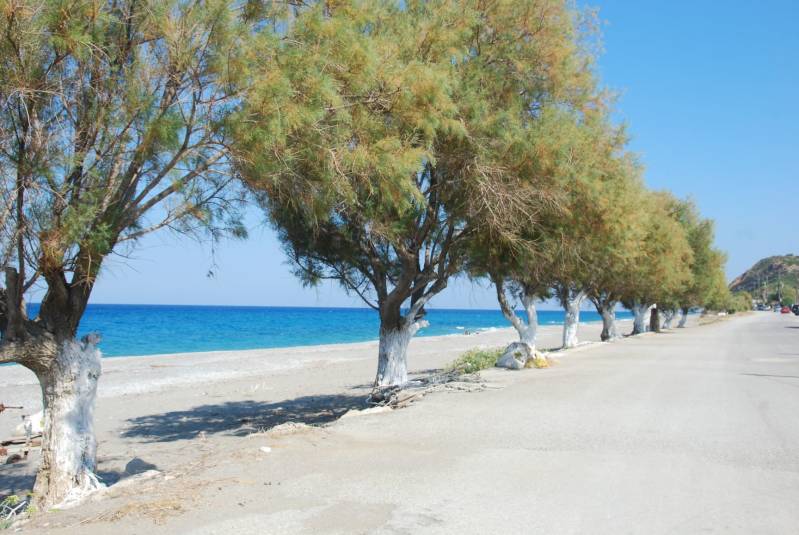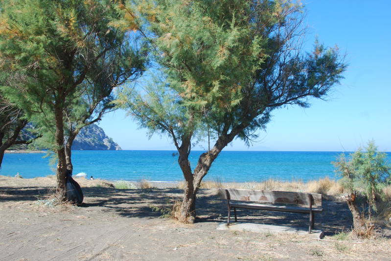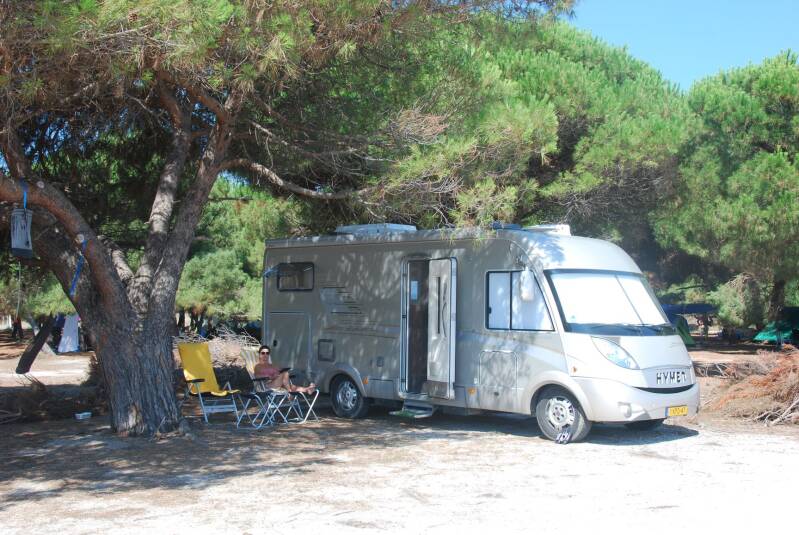 Uiteindelijk komen we, moegekeken van allerlei bijzonderheden, aan bij het strand van Mourteri. Niet echt een toeristenoord. Een lange, deels verharde kustweg, biedt ons veel sta-mogelijkheden. Mooi tussen twee bomen en tien meter van de zee, krijgt de Hymer rust.