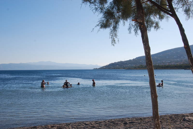 Het is weer een plaatje. Een kleine baai met een grindstrand meet aan beide zijden heuvelruggen. Waar de linker een bos herbergt, bevindt zich op de rechter het stadje. Over zee kijk je niet ver want de horizon wordt gevuld met het vaste land wat ook bestaat uit heuvels en bergruggen. Achter zo’n rug ligt Athene. Het kleine strand biedt aan twee taveernes voldoende omzet. De hele dag door is het een komen en gaan van vooral Griekse badgasten.