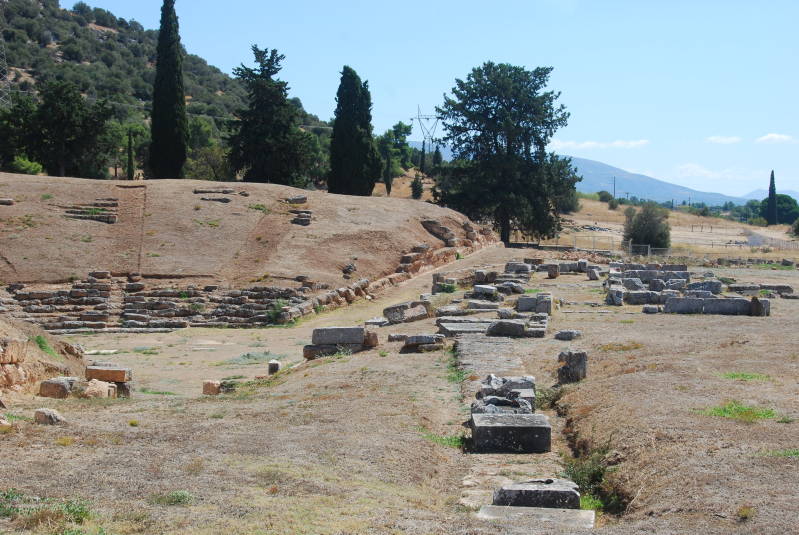 Ik strompel het historische veld op en probeer wat informatie tot mij te nemen. Heiligdommen voor Apollo en Demeter, woningen voor welgestelden en toegangspoorten hebben hun resten en fundamenten prijs gegeven aan nieuwsgierigen uit de huidige tijd. Ik zie de duidelijke vormen van een theater maar de laatste voorstelling is al even terug. Ik lees dat het gymnasium aanvankelijk bedoeld was voor het aanleren van atletische en militaire bekwaamheden maar dat dit door ontwikkelde naar intelligente en psychische vaardigheden.