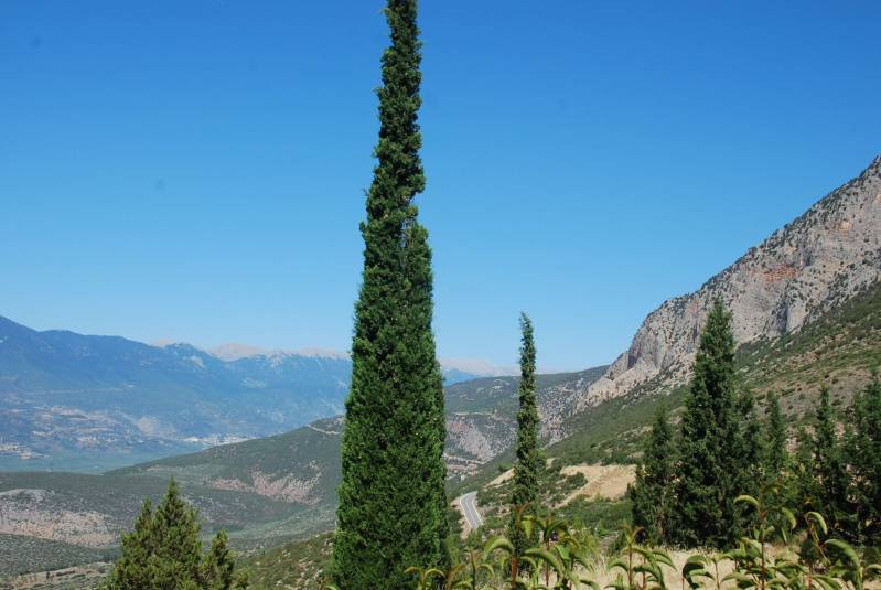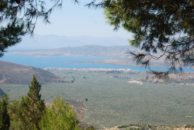 Wat weer een fantastische route om te rijden. We zijn onderweg van Delfi naar Nafpaktos en de weg loopt strak langs de golf van Korinthe. Heeft de natuur een fraaie baai gevormd, dan volgt de weg nauwgezet iedere ronding. Stevige heuvels dagen ons uit maar leveren ook een prachtig panorama. Aan de overzijde zijn de bergen van de Peloponnesos te zien, daarvoor ligt zo nu en dan een idyllisch eiland, voorzien van het nodige groen en vaak met een riante woning.