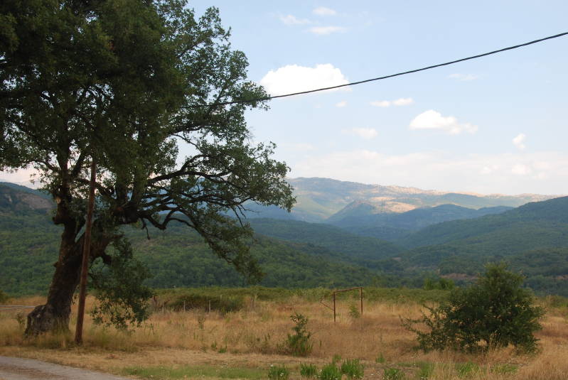 We verlaten het lange strand van Psaropouli. De rit gaat meteen bergopwaarts. Als er na enige tijd een mooi gelegen parkeerplaats met schaduw en uitzicht aandient stoppen we om eens echt zuivere berglucht in te ademen. Hoog gelegen plaatsen hebben altijd een koele wind en zo zitten we prinsheerlijk een groot stuk van Evia te overzien.