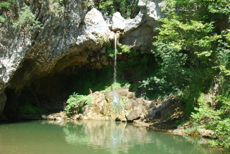 Op Noord-Evia liggen de zeer fraaie Drymona watervallen. Na een lange scooterrit komen we aan op de parkeerplaats. Er staan behoorlijk wat auto’s. Al snel ontdekken we de trap naar boven met de Griekse aanduiding voor waterval. De folder gaf al een tempering van de verwachtingen. ‘Afhankelijk van het seizoen’. Er had moeten staan ‘In de hoogzomer kurkdroog’. We reageren onze frustratie af door een appel te eten en wat water uit de fles te drinken. Dan beginnen we voorzichtig aan de afdaling.