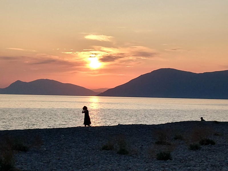 De avond valt en een serene rust daalt neer op onze vallei. De zee wordt door het wegvallen van de wind een gladde oppervlakte. Tientallen vakantiegangers staan zonder enige restricties vrij in het open veld te genieten van wat Griekenland te bieden heeft.