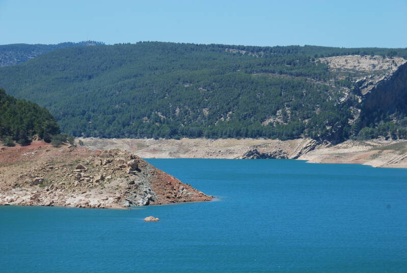 Over het in-blauwe water turen we naar de overliggende oever. De bergen aan de flanken zijn getooid met dennenbos. Een grote kale rots staat markant aan de overzijde. De zeldzame auto, die gebruik maakt van deze route, zien we als stip over het gesteente kruipen. We halen er een drankje bij. In de zwoele wind op ons schaduwrijk plekje onder bomen smaakt deze een keer zo lekker.