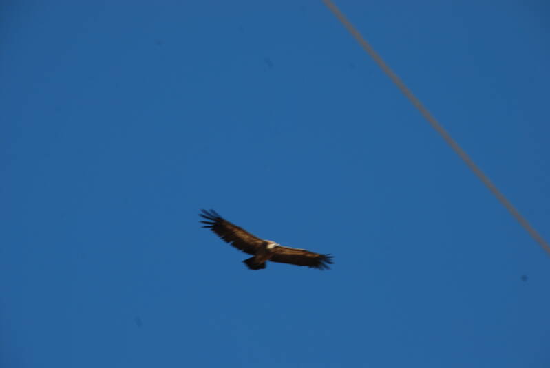 De camper parkeren we op een pleintje waar vanaf we een bijzonder uitzicht op de omgeving hebben. Een vijftal vale gieren trekt onze aandacht. Rondzwevend op de thermiek zijn ze dan weer vlak boven ons, dan weer als stipjes op ruime afstand.