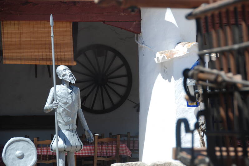 Inmiddels zijn we de regio La Mancha binnengereden. Het is hier waar de legende van Don Quichot is opgeplopt. In het dorp Puorto Lapice zoeken we een plaats om koffie te drinken en vinden die uiteindelijk op de plaatselijke CP. Op een heuvel staren plotsklaps drie klassieke Spaanse windmolens ons aan. In gedachten zien we de verwarde Don al ten strijde trekken, gevolgd door zijn trouwe metgezel. De molens zijn opgebouwd als een spierwitte recht opgetrokken cilinders met een rond kapje van riet. Hier tegenaan is een doorzichtig maar te klein wiekenkruis gezet.
