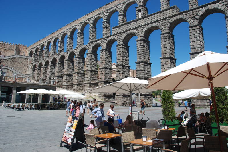 Het begint laag als een onschuldig muurtje. Hanna en ik hebben er geen aandacht voor tijdens de kuier naar het centrum van Segovia. We vermoeden de oude stadsmuur. Als er 100 meter verder aan de onderzijde kleine ronde bogen in de muur verschijnen, moeten we de thesis herzien. Terwijl wij al dalend het centrum naderen, blijft onze stenen wand waterpas en krijgt het steeds hogere bogen. Na een bocht begint het tot ons door te dringen dat het wonder waar wij naartoe onderweg zijn, al minutenlang aan onze zijde is. In de Romeinse tijd is in deze stad een aquaduct gebouwd over een 40 meter diep dal om water naar het centrum te kunnen transporteren.