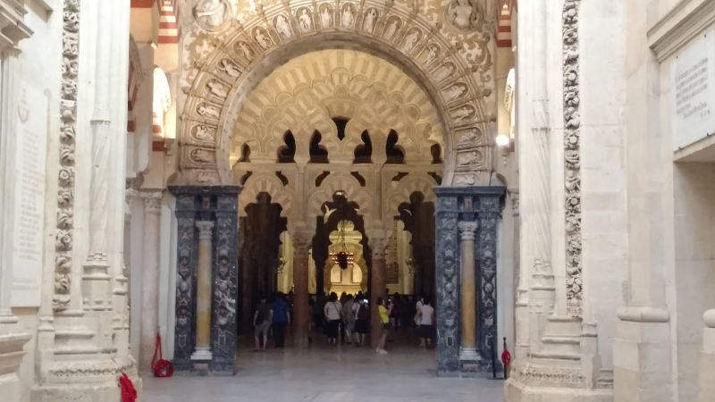 De moren werden door de Spanjaarden weer verdreven naar Afrika en het gebouw veranderde van geloof; van moskee naar kathedraal. En dat is aan het interieur te zien. Tientallen nissen zijn voorzien van Bijbelse taferelen. Overal hangen kruizen, zelfs in de kroonluchters. Alleen de basisconstructie verraadt de hand van de oorspronkelijke bouwmeester. In het hart van het godsgebouw is een heuse kathedraal gepropt. Van een uitgebreid koor, tot een groot achterschip; het is onmiskenbaar een katholieke jas aangetrokken.