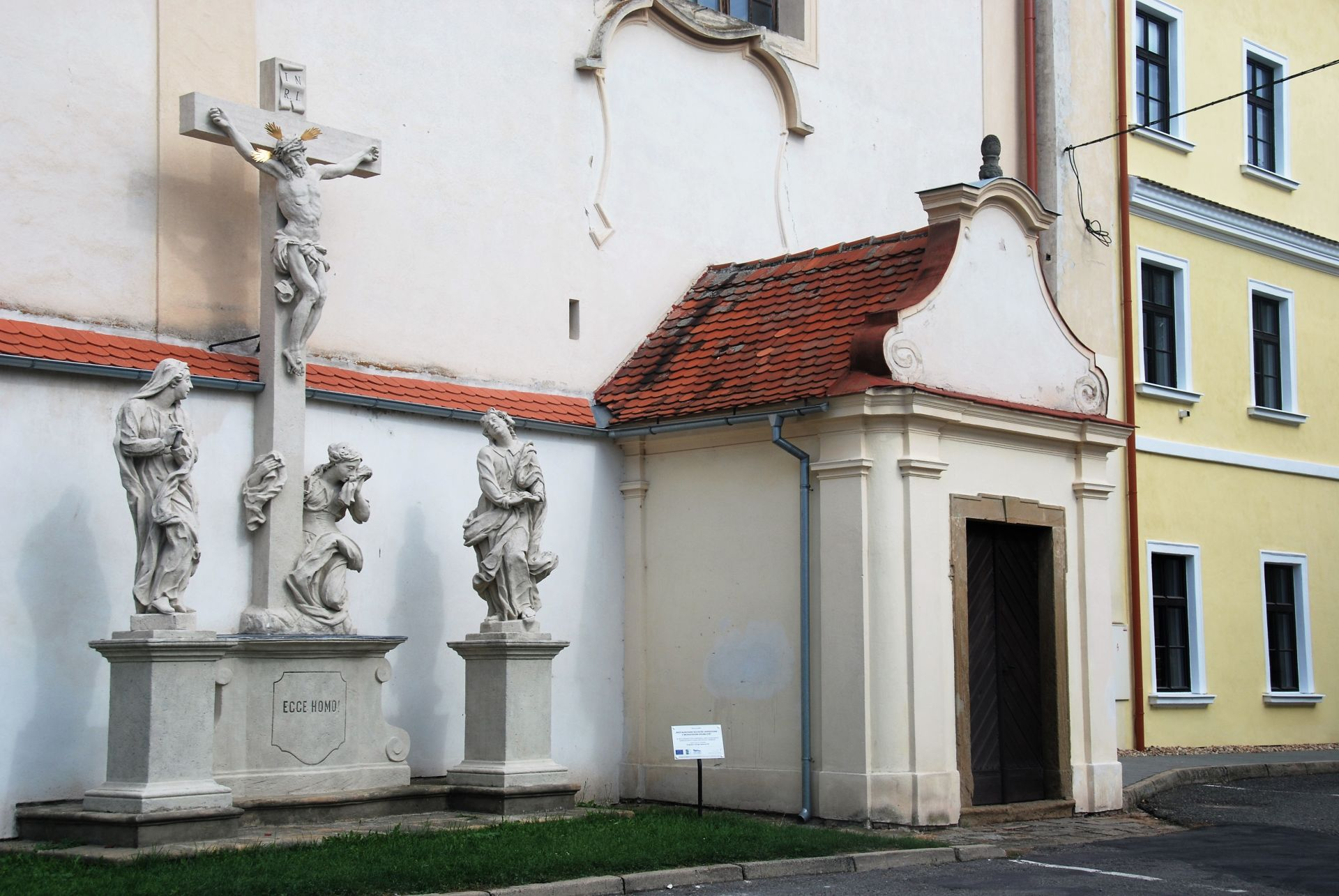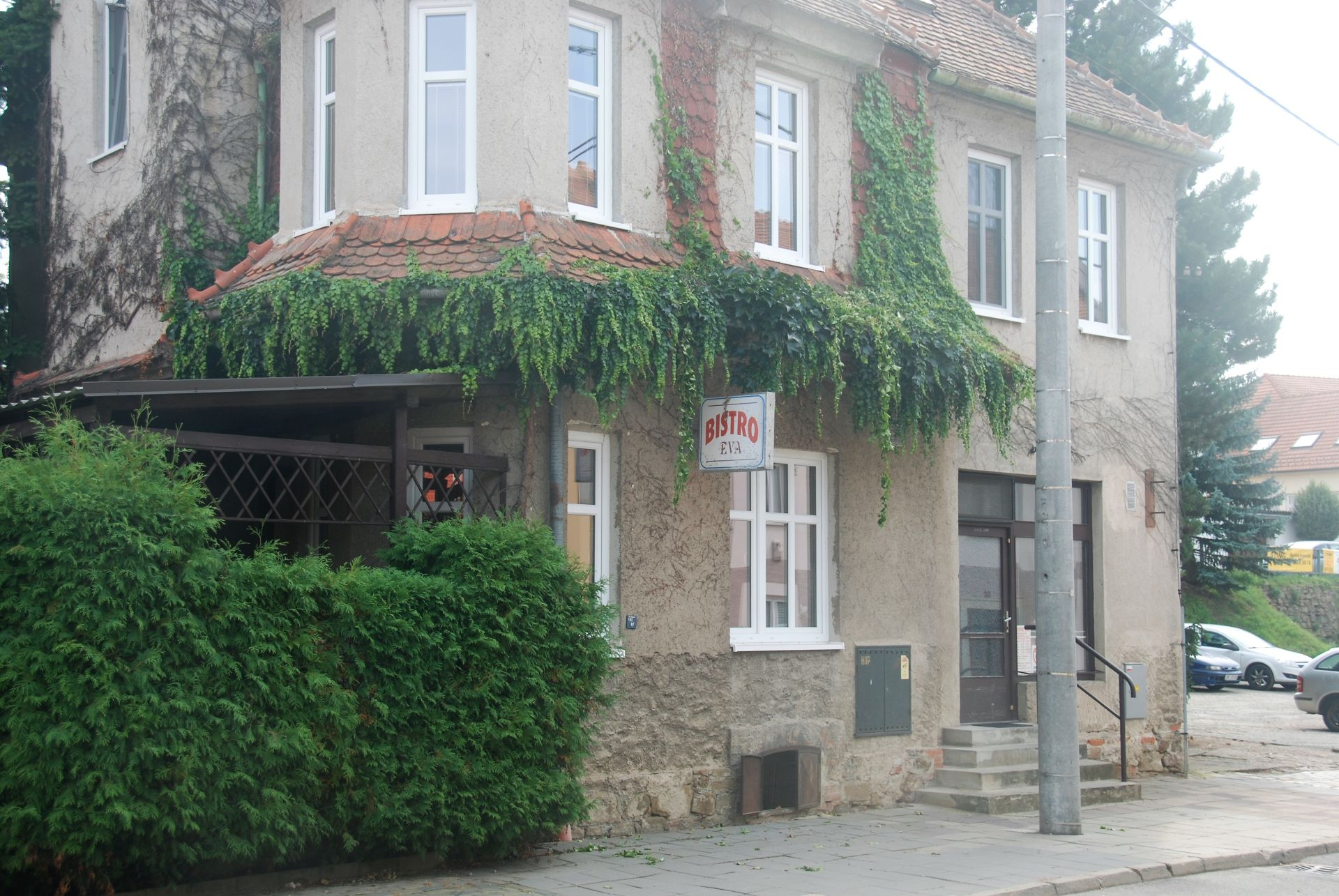 Hanna en ik lopen het dorp in. Op een heuvel, hoog boven de plaats, staat een grote villa met een machtige uitstraling. Krumlov is heel zakelijk aangelegd. Vrij rechte wegen met niet echt bijzonder mooie huizen. Tuinaanleg is niet nodig daar alle huizen direct aan de straat staan. We komen voorbij een kerkje wat een charmante architectuur heeft. Het zit strak in de witte saus.