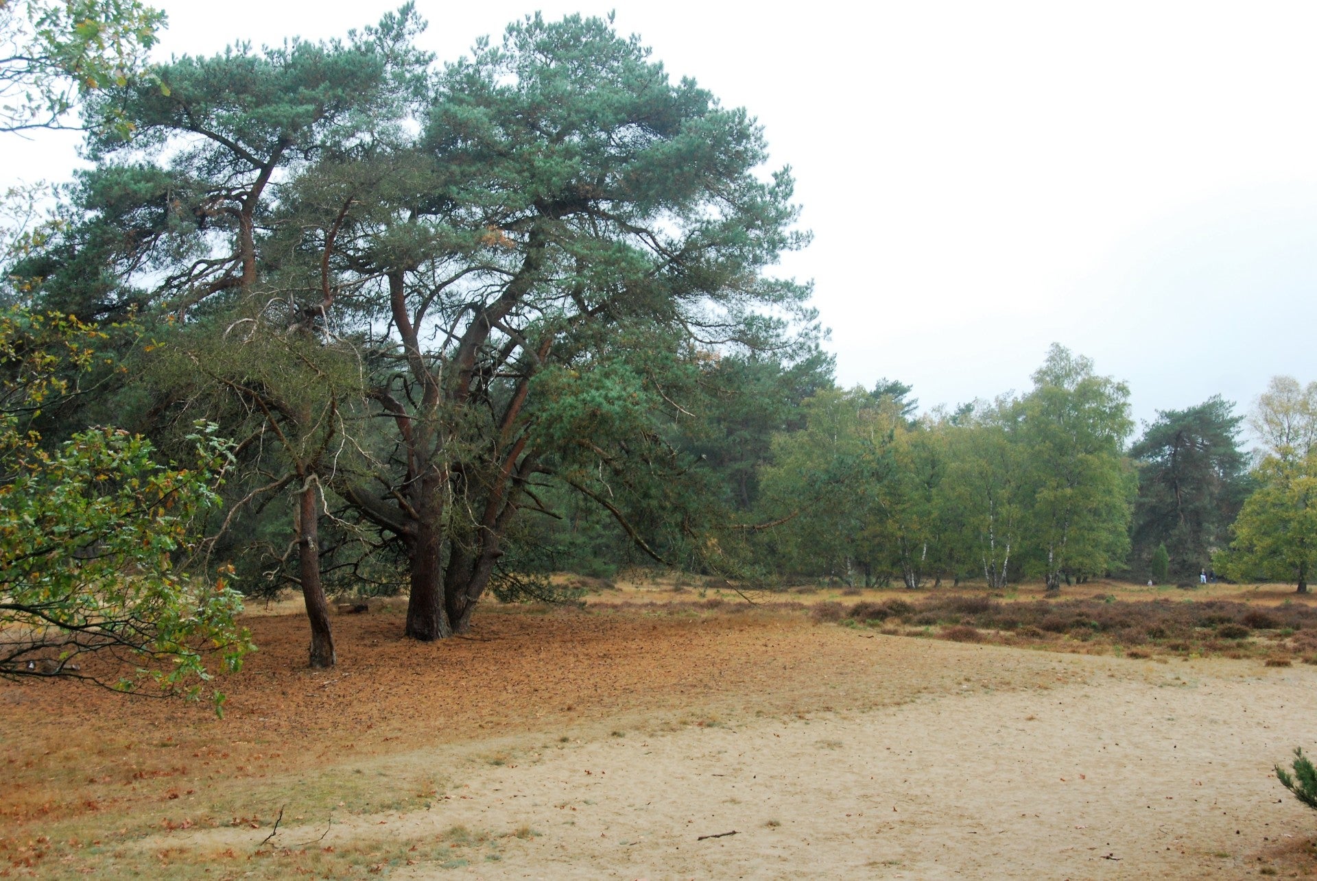 Het is heuvelachtig. Dit zorgt ervoor dat het te belopen pad onoverzichtelijk blijft. Ik passeer een enkele wandelaar. We groeten kort. Opeens breekt meer licht door de bomen. Er achter zie ik geelwit zand oplichten. Na een paar stappen ligt plots een open vlakte voor mij. Zandverstuivingen hebben een heel nieuw landschap geschapen. Heide doet z’n best om de vlakte kleur te geven. Hier en daar steekt een boom zijn krachtig silhouet tegen de donkergrijze lucht.