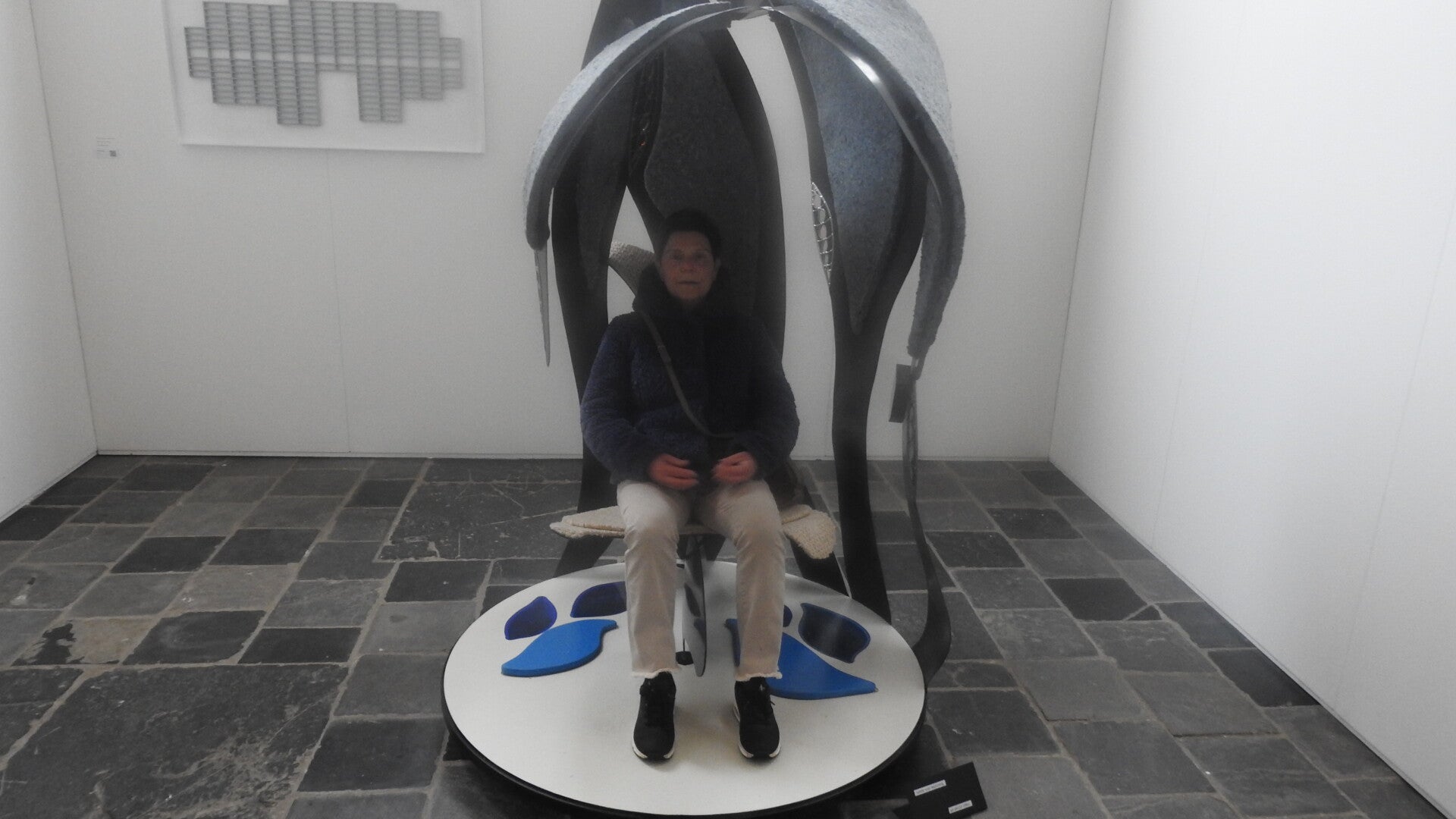 We nemen alle tijd om de kunstproducten op alle drie verdiepingen te bewonderen. De start is bij zeer simplistische schilderijen. Verderop is er wat meer techniek nodig om de maker te evenaren. In een zaal staan vier klankhoorns opgesteld. De medewerkster laat ze hun geluid de zaal in galmen door met een forse hamer er tegen aan te slaan. In de kelder zien we werken van schilders uit het verleden. Ook hangen er 20 berkenbomen aan het plafond heen en weer te wiebelen. Kunst blijkt ook hier een ruim begrip.