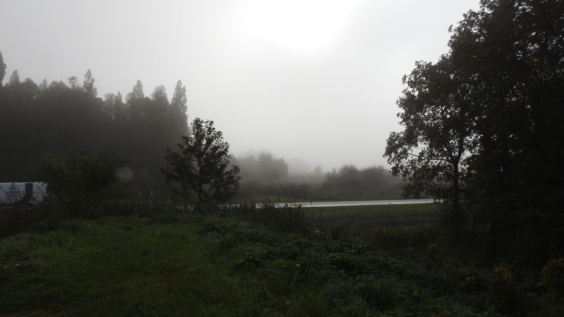 We verlaten de heuvel en lopen over het aangelegde pad. In de nevel lijkt alles zwart en wit. Toch komen ook de herfstkleuren langzaam tevoorschijn. Maar van Konikpaarden geen spoor. Als we een eind hebben gelopen, komt een kleine waterplas in ons beeld. Tegen de oever huist een zilverreiger, terwijl eenden aan het foerageren zijn midden op de plas. Dit gebied moet bij helder weer prachtig zijn, nu heeft het iets mysterieus.