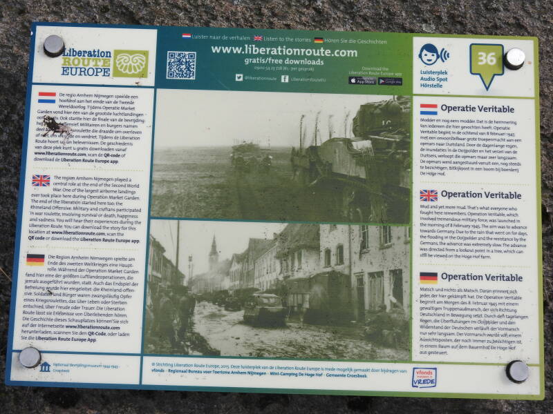 Een plakkaat op een steen vertelt dat vanuit hier in februari 1945 een grote aanval op nazi-Duitsland is ingezet. De geallieerde commandopost was in een boom op het erf gebouwd vanwege het uitstekende overzicht. Het werd een lange strijd in de modder omdat het dagen achtereen regende.