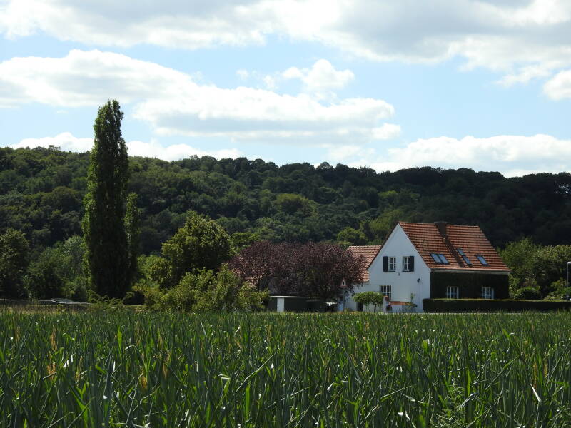 Als we een kilometer verder zijn, passeren we de grens met Limburg. Een wijnboer is druk in de weer met tractor en tank om z’n druiven te bespuiten. De zon staat hoog aan de hemel en zal vandaag de temperatuur op 29 graden weten te krijgen.
