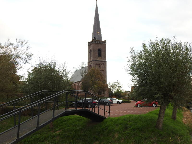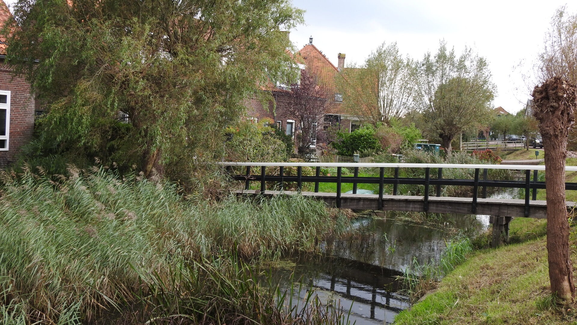We hebben uitzicht op de ruime velden van Noord-Holland. Een boogbrug is statig over een brede sloot getrokken. In het weiland lopen een aantal schapen. Een zeemeeuw scharrelt zijn kostje bij elkaar. De kerktoren waakt over dit fraaie stukje natuur, terwijl hij op halve en hele uren zijn klokken laat klinken.