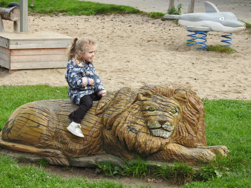 Een bijzondere dag vandaag. We verlaten de camper en gaan met een auto op stap. Onze dochter Helen rijdt ons naar het landgoed Hoenderdaell in Anna Paulowna. Ook onze kleindochter Jip is er bij. Op dit landgoed worden dieren uit de hele wereld opgevangen en tentoongesteld. Vaak zijn dit beesten die uit slechte omstandigheden komen, zoals uit een dierentuin in oorlogsgebied. Verder zijn diverse exotische vogelsoorten en uit het water geviste zielepoten, zoals zeehonden en bruinvissen. We wandelen door het ruim opgezette park en passeren zo nu en dan een natuurlijke kooi waarin zich een bepaalde diersoort bevindt. Bijzonder van opzet is het leeuwen en tijger verblijf. Omdat deze getraumatiseerd zijn, zitten ze in geheel door groen omringde kooien. Het publiek mag door kleine gaten loeren om van hun schoonheid te genieten. Op deze manier kunnen de beesten weer normaliseren.