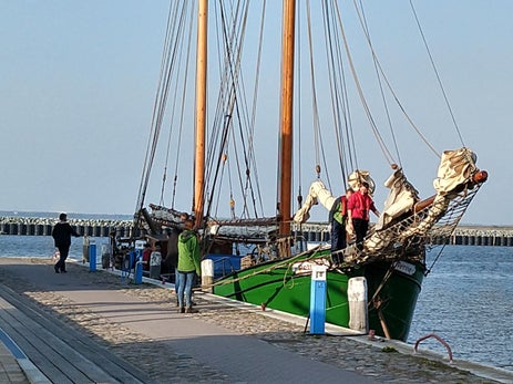 Het is druk in de winkelstraat. Alle detaillisten hebben een ruime uitstalling op de stoep. Terrassen in de zon zitten vol. In de tijd van zomerse topdrukte moet het hier krioelen van de badgasten. Een lange pier gaat een heel eind de Oostzee in. Door de straffe wind is mijn pet niet veilig en daarom neem ik hem in de hand. We ploffen neer op de stoelen bij een ijssalon. Ze hebben een breed assortiment en zo zitten we even later met een kop koffie en een fraaie versie van de apfelstrudel voor onze neus.