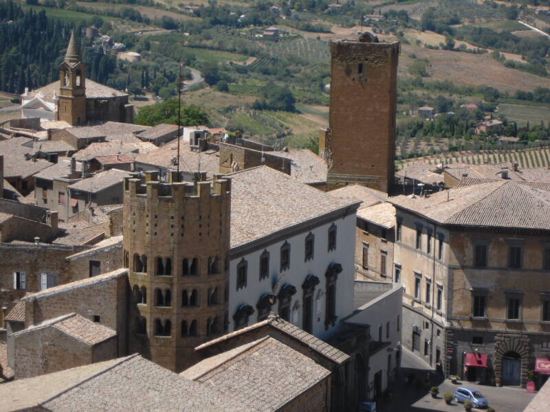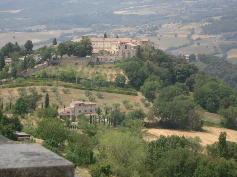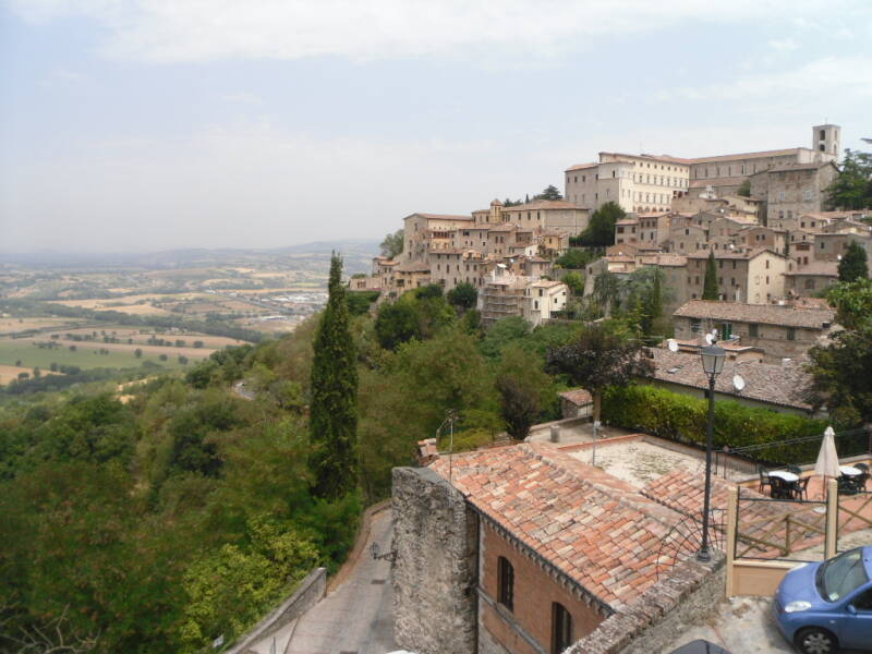 We staan zo prachtig tussen de cypressen dat we besluiten hier nog een dag te blijven staan. We maken een wandeling door stadje en komen op leuke plekjes. Bij een pleintje hebben we een prachtig uitzicht over de omgeving omdat Todi hoog boven de omgeving ligt.